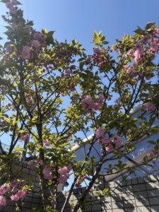 玄関横花壇の八重桜が咲き始めました。五分咲きくらいです。毎年、ソメイヨシノより1週間から10日遅れて満開になります。濃いピンク色が青空に映えていますね。もう少しの間、楽しませてくれそうです。